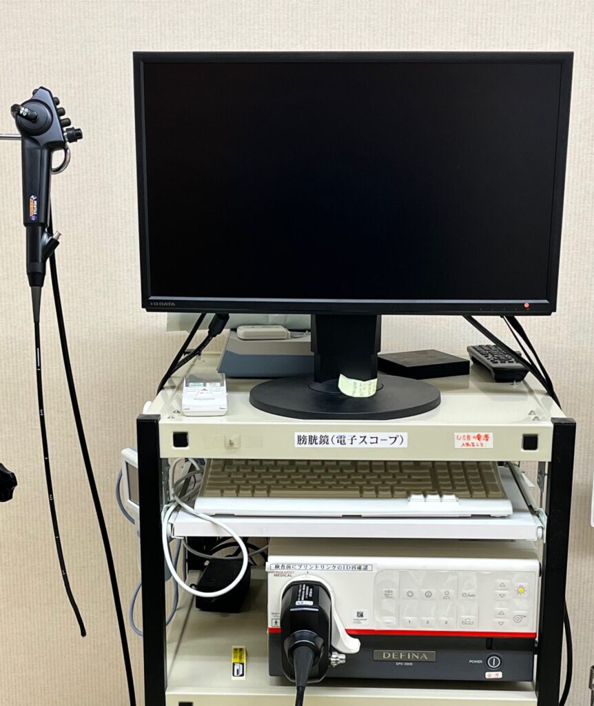 膀胱電子スコープ「Pentax ECY-1575K」と光源・画像プロセッサ「EPK-3000」です。膀胱内の観察が低侵襲でおこなえます。
